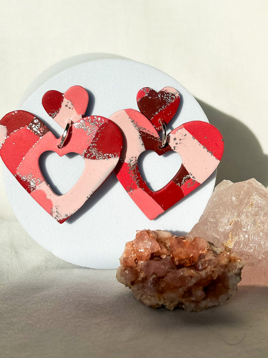 Patchwork Pinks Red Silver Stacked Heart Dangle Studs Clay EarringsRegular price $14.00 USDRegular priceUnit price / per-