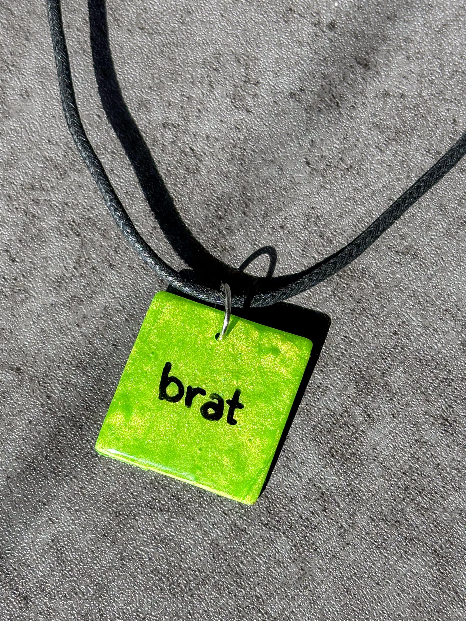 Brat green polymer clay, hand painted text, coated in UV resin for protection.