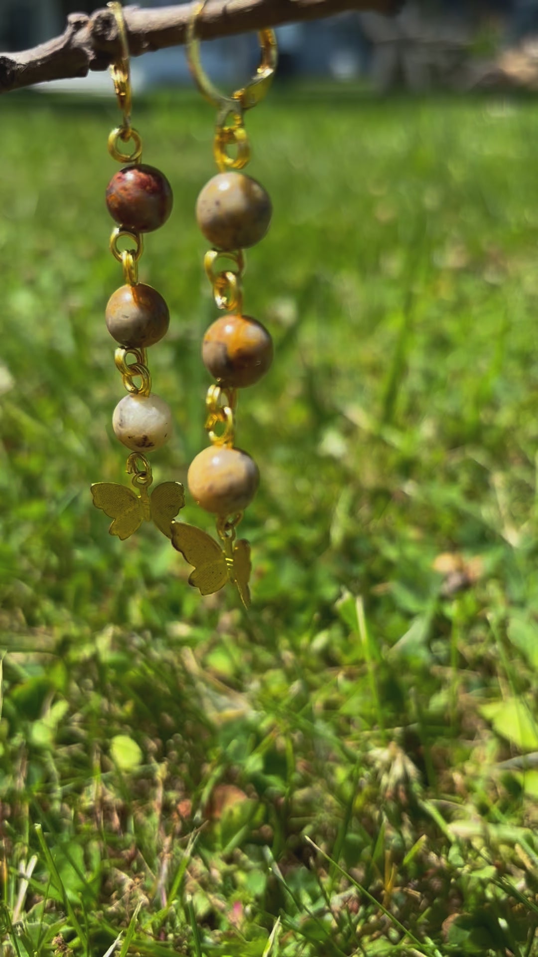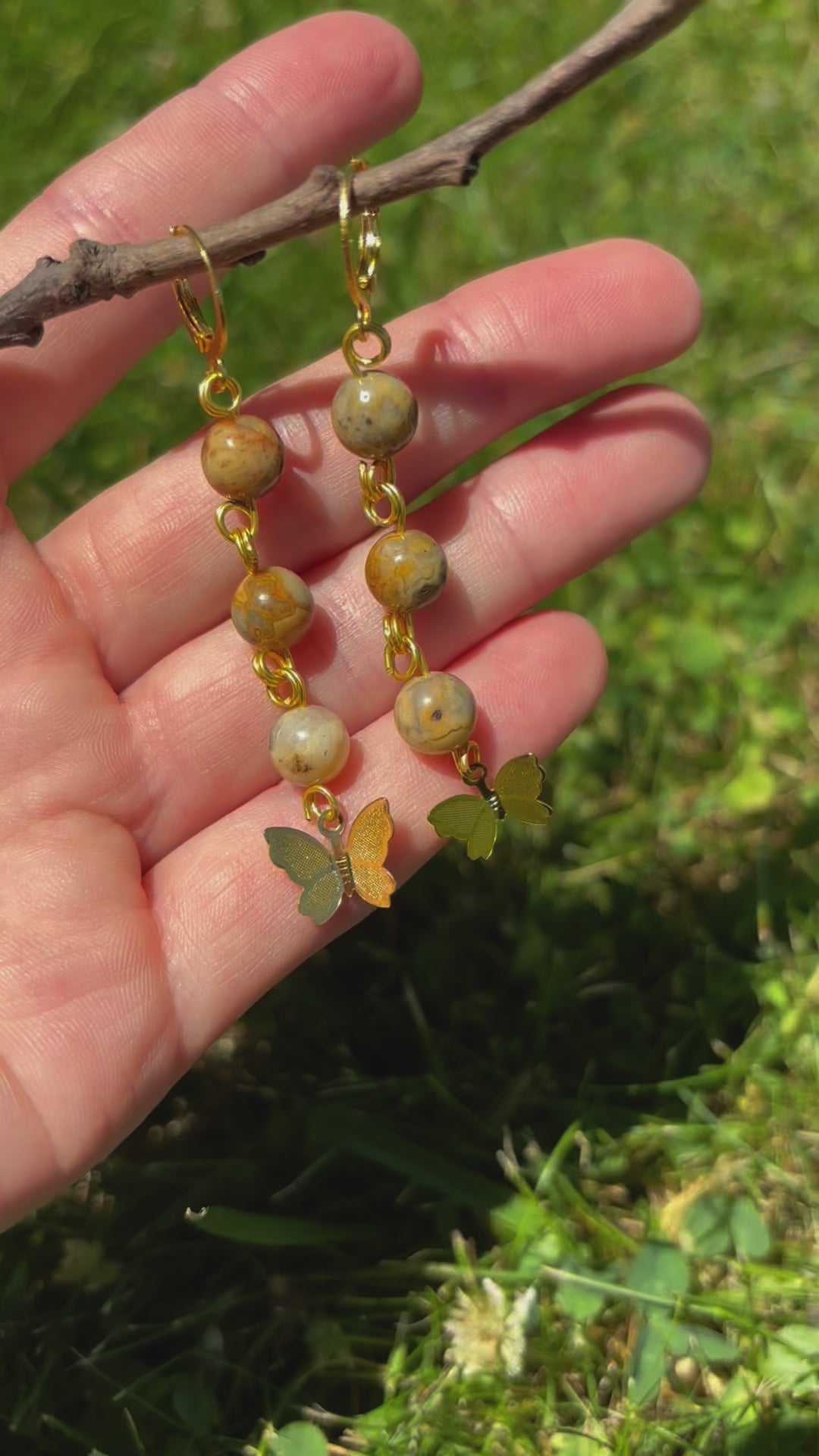 Crazy Lace Agate Crystal Butterfly Charm Gold Dangle Earrings