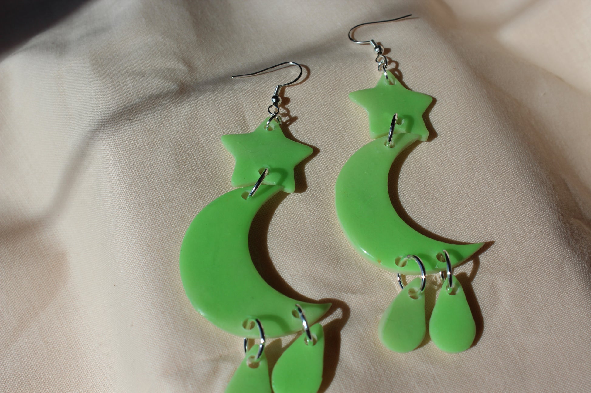 Green Glow In The Dark Stacked Moon Star Handmade Clay Earrings