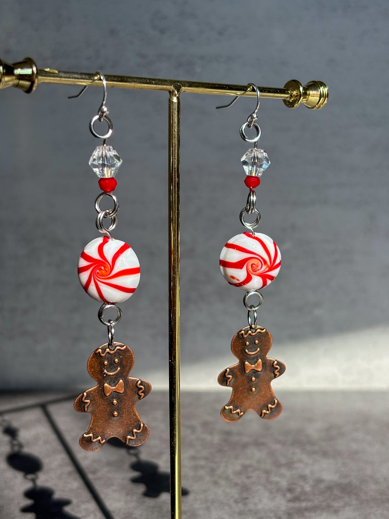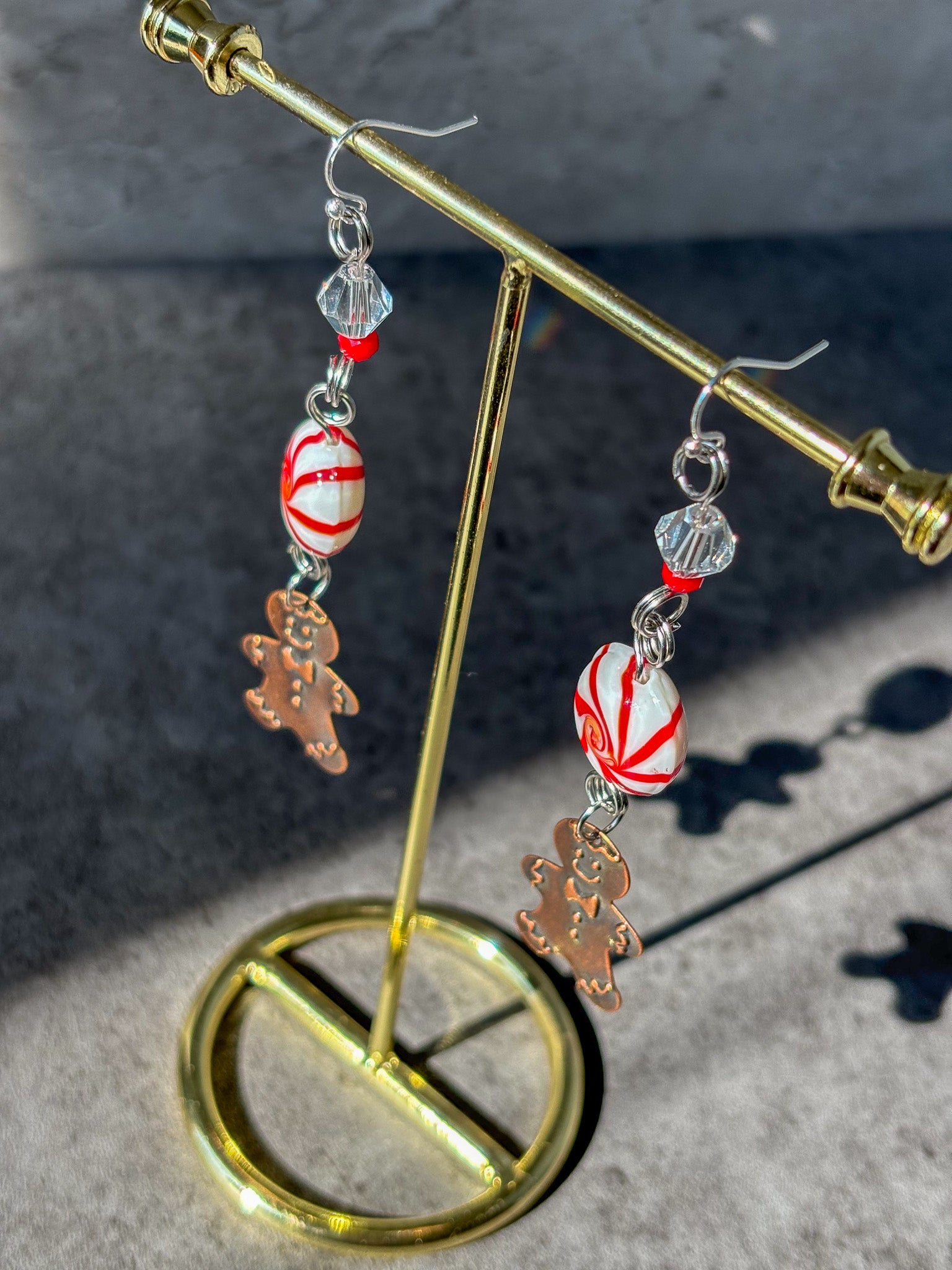Peppermint Gingerbread Man Dangle Red Sparkle Earrings