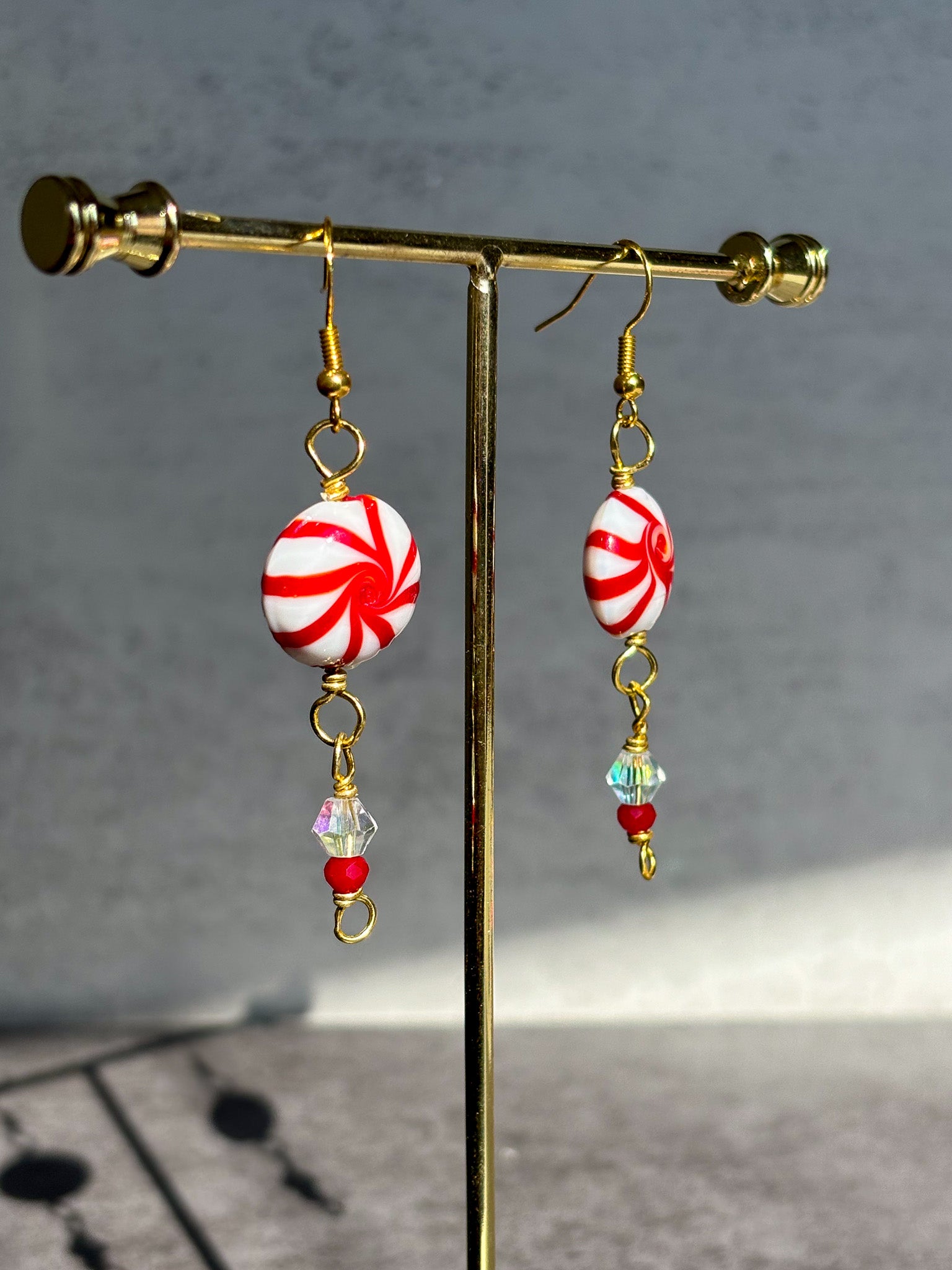 Peppermint Red White Sparkle Gold Dangle Earrings
