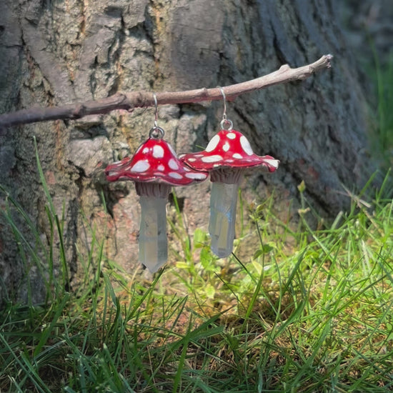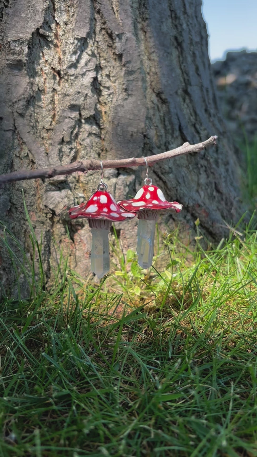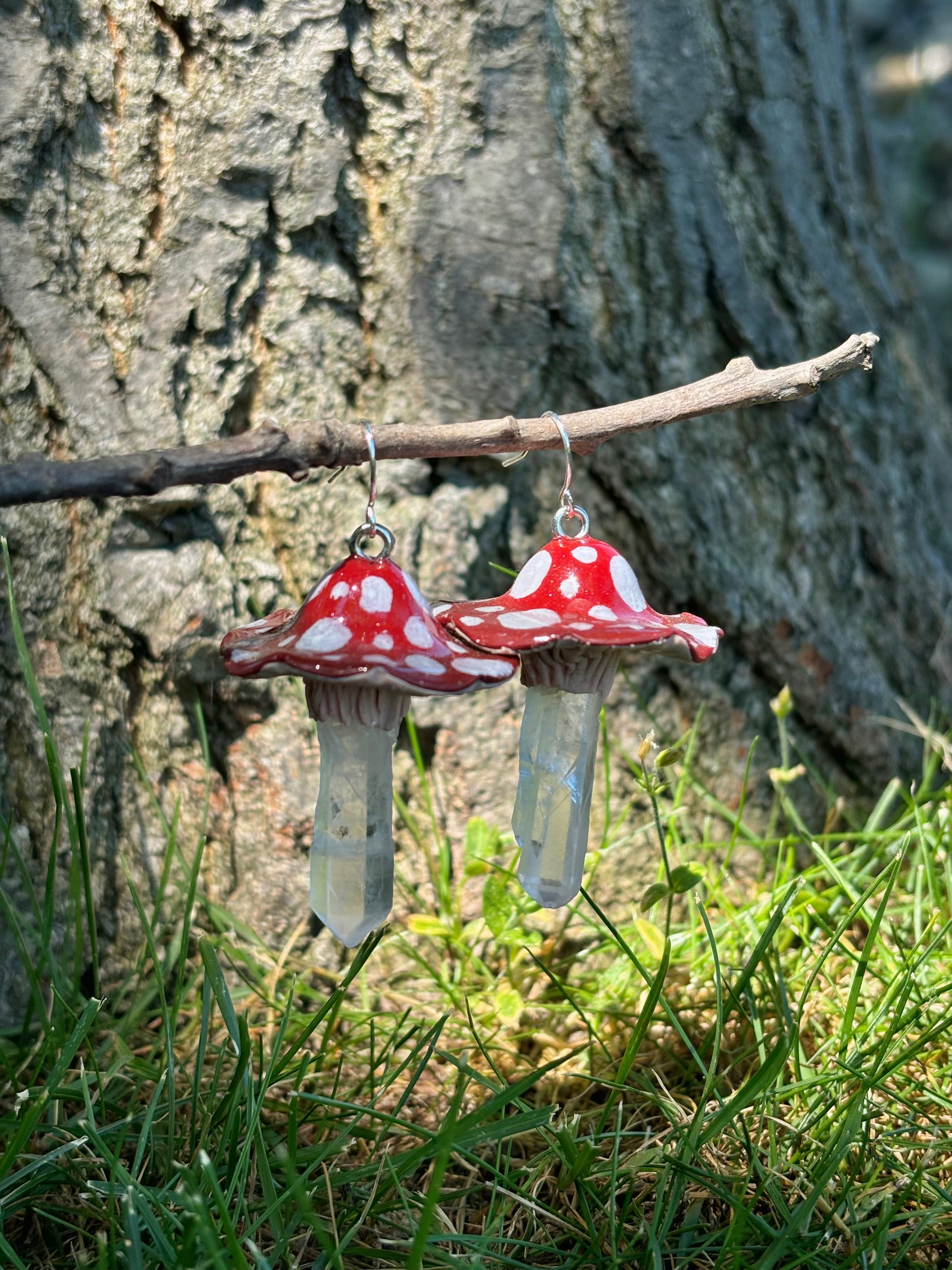 Quartz Crystal Point Red Mushroom Dangle Earrings