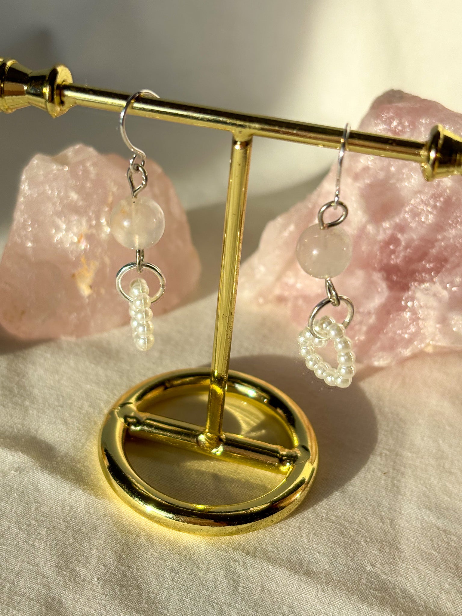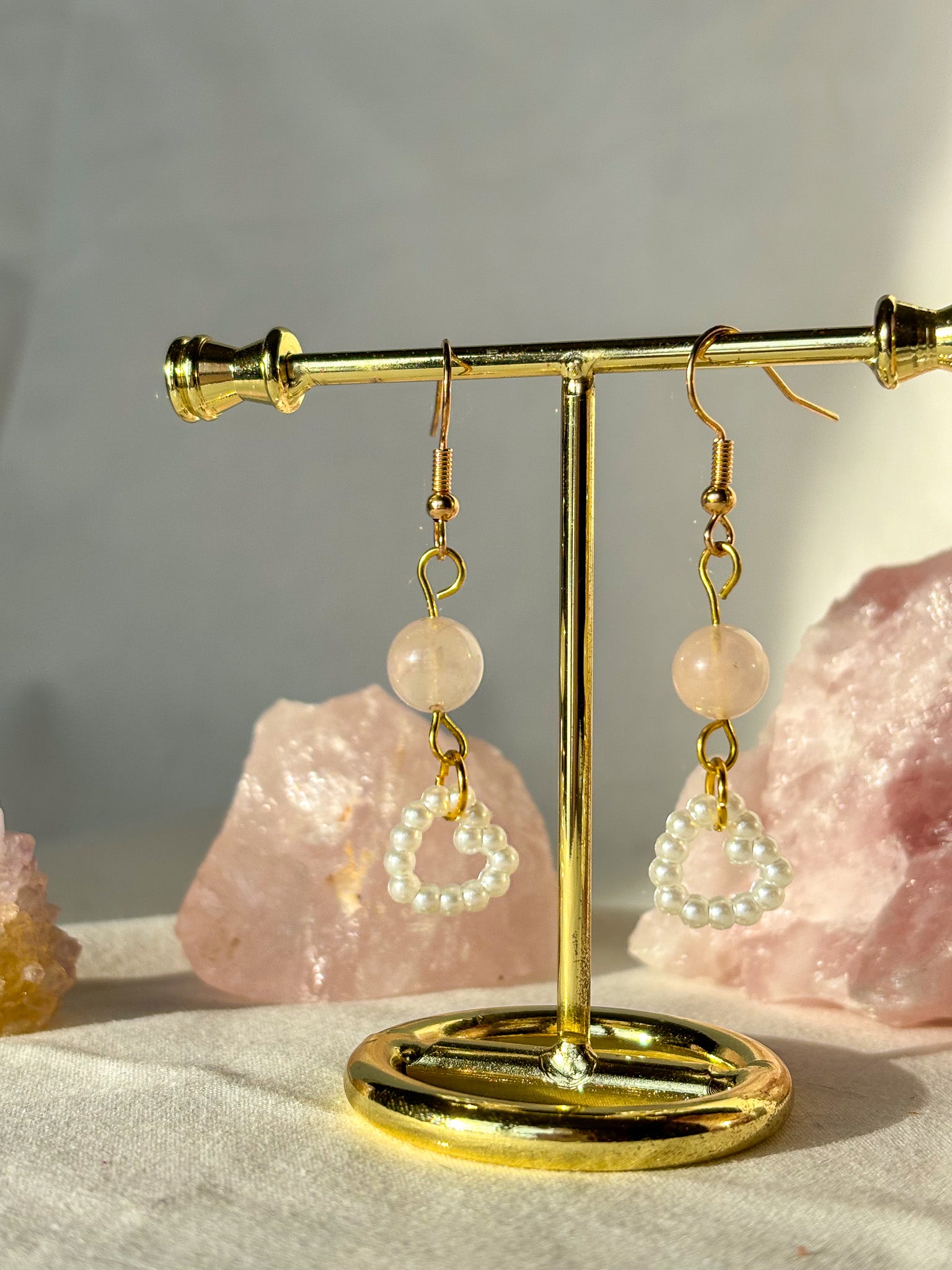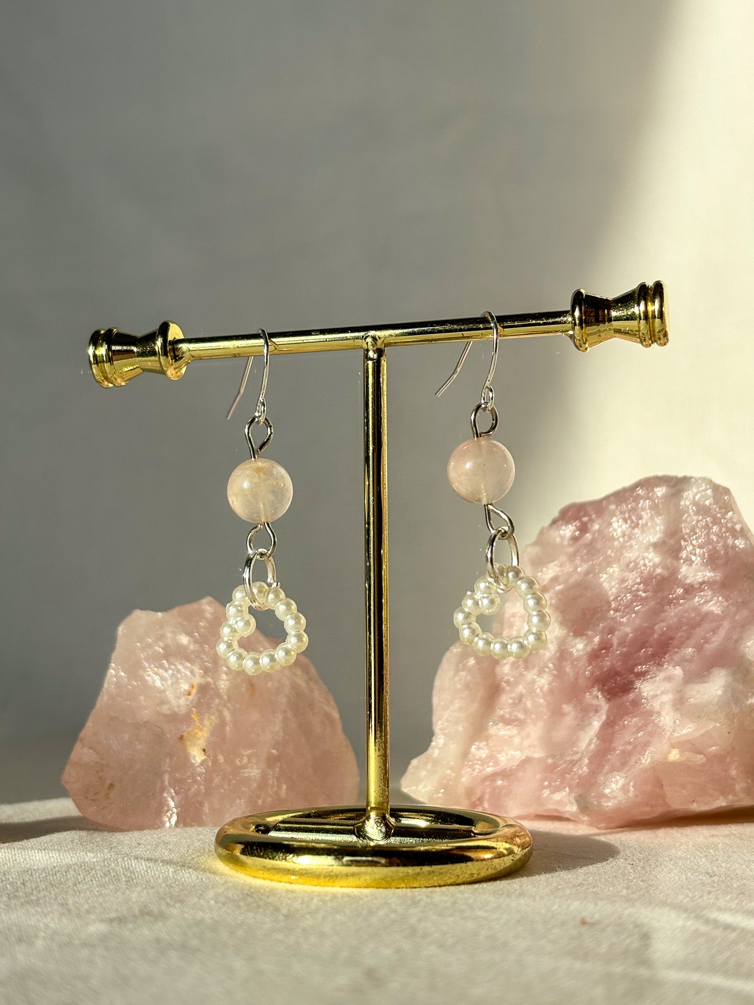 Rose Quartz Crystal Pearl Heart Beaded Dangle Earrings