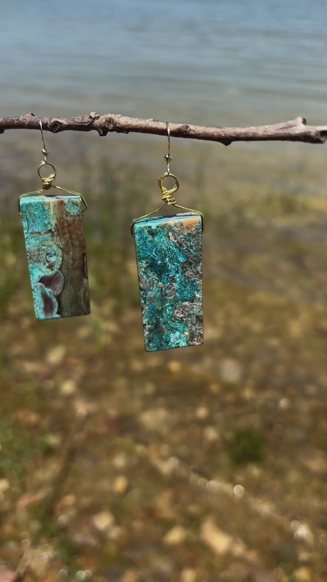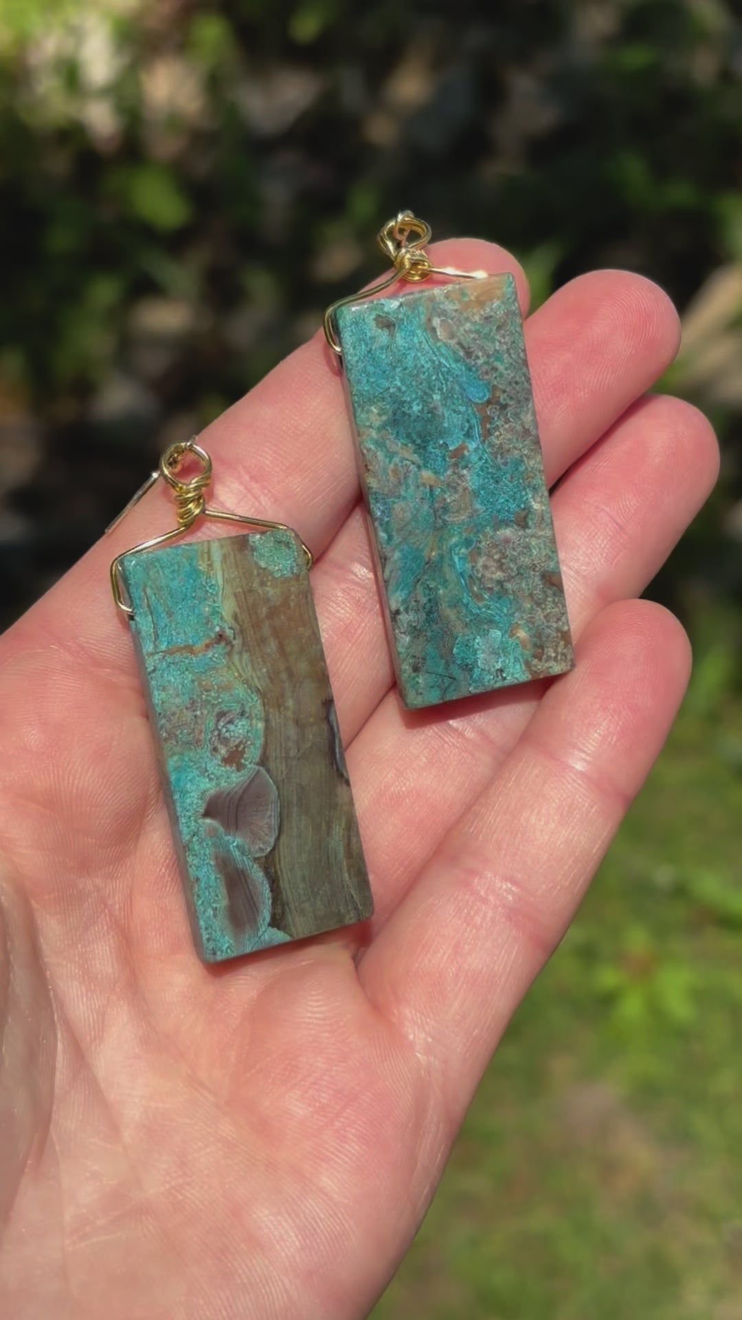 Shattuckite Azurite Crystal Gold Dangle Earrings