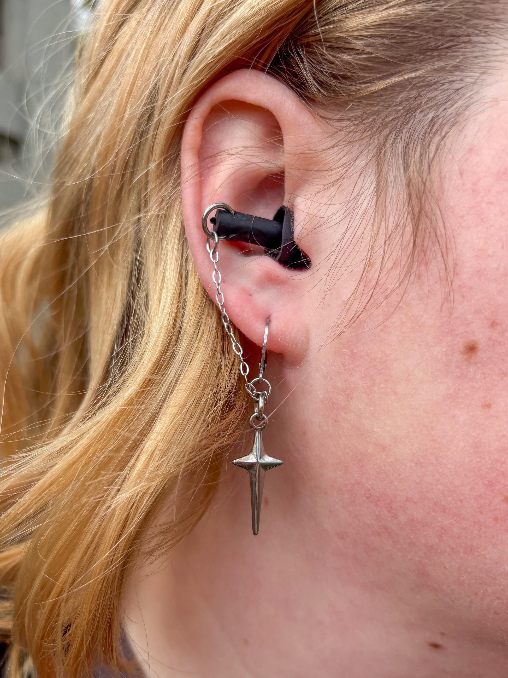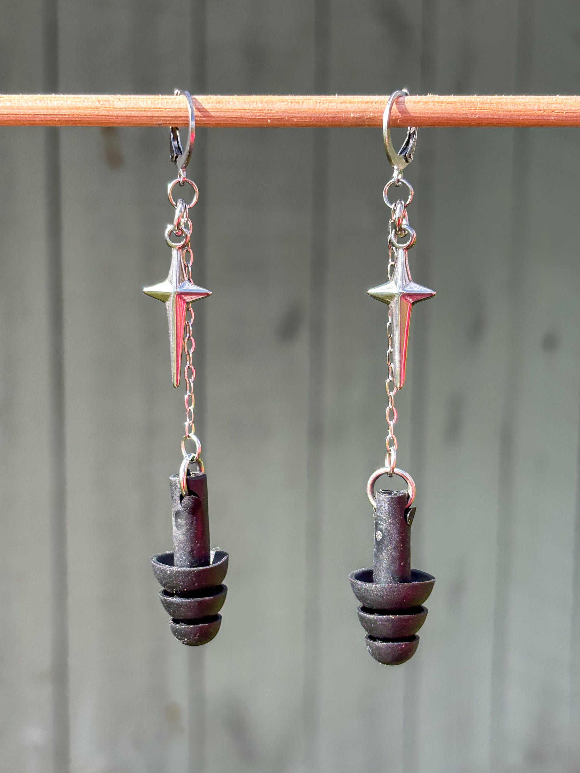 A pair of earrings designed with high quality hypoallergenic stainless steel leverbacks, suitable for most ears. Earplugs are made of 100% silicone.