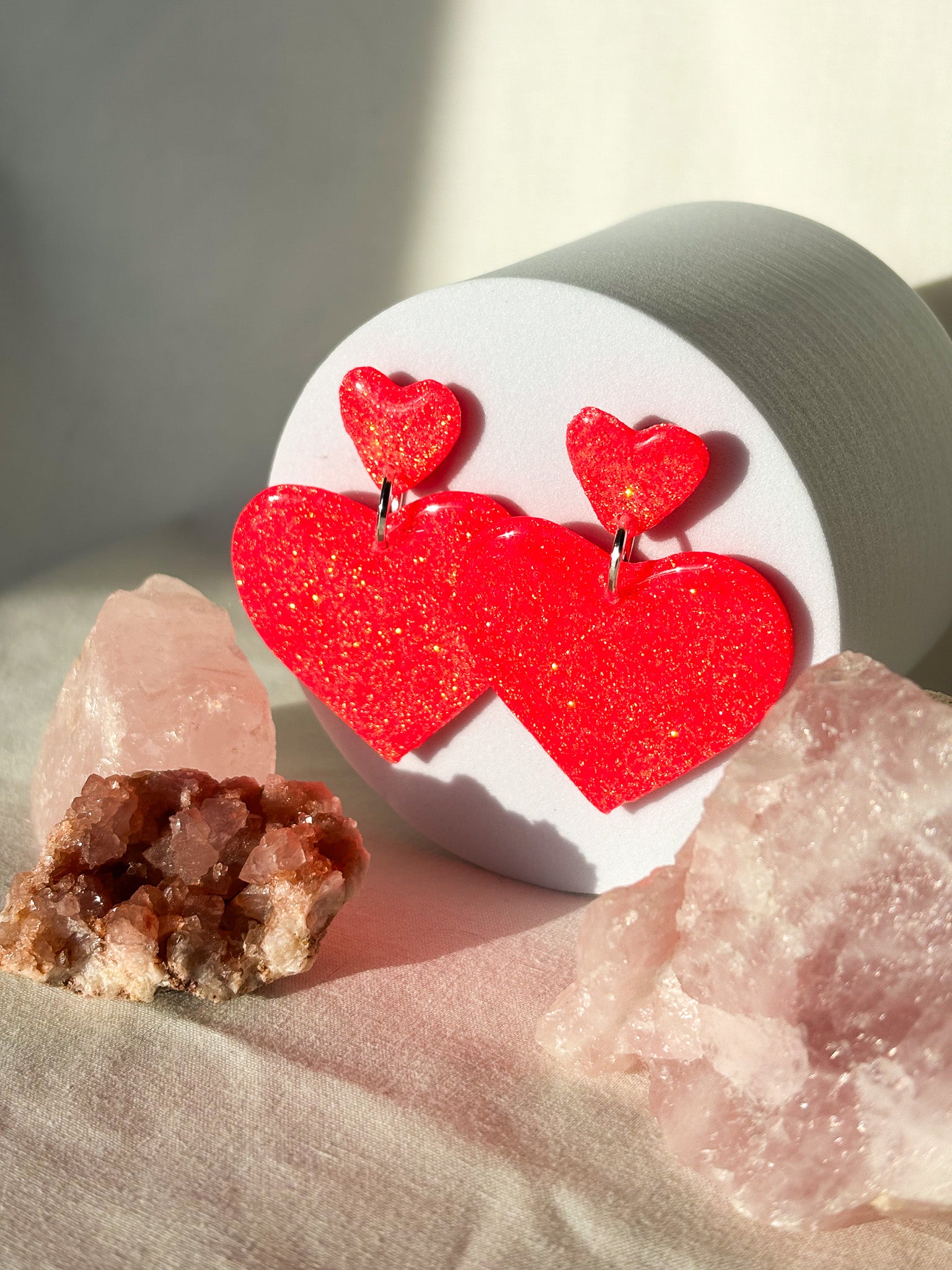 Sparkly Bright Red Stacked Heart Clay Dangle Stud Earrings